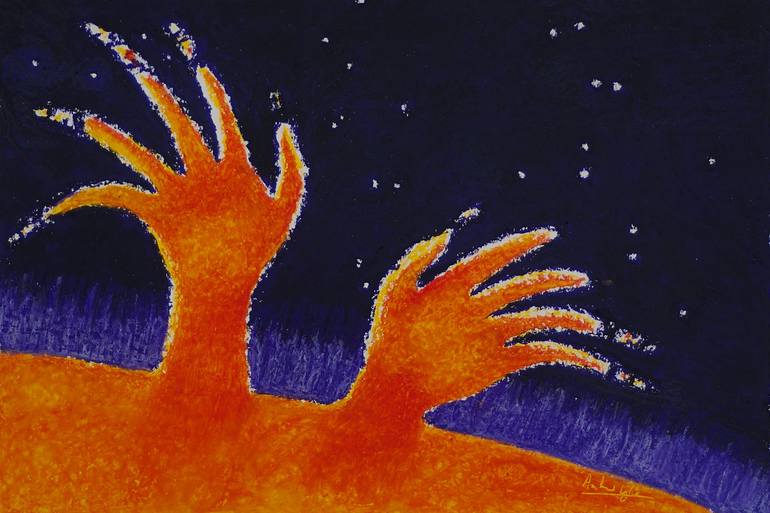Whimsical collection, AstroDomine series. A vivid oil pastel depicting hands flaring out from a star. Partly inspired by a famous prog rock song. A sense of immense power but also an undertone of agony.