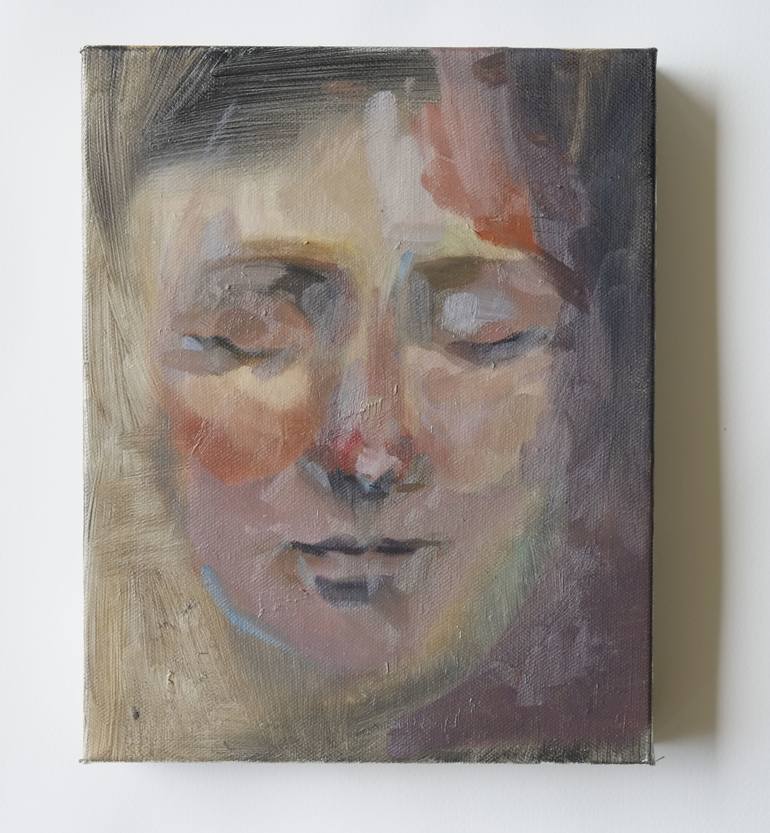 One of a series of small oil paintings of faces with closed eyes. As a yoga teacher, I see faces in this way frequently during the final posture of svanasana, or corpse pose/ relaxation. These faces display the beauty of inner ease, the softness of peace sensed within, the hope of peace beyond. This...