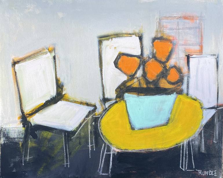 Charlottesville, Virginia abstract artist. Represented by Capital Artists Collective, (Washington DC), Serena and Lily, One Kings Lane, Harris Fine Art, (Charlottesville, Va), Art Des Femmes, (NYC) Please see my "COLLECTIONS" section to view art organized by style. ARTIST STATEMENT: Sarah Trundle is a Charlottesville, Va. painter who, after beginnings in representational art, now works primarily in abstraction. Bold and colorful geometric shapes are the hallmarks of her work which, along with the very paint itself, are what she considers her "subjects". Her unique and many-layered paintings range from brightly colored, playful abstracts, to serene, monochromatic horizon line paintings- the seemingly disparate styles representative of her exploration of the relationship and between order and chaos that fuels her process. Her work results from a largely intuitive process that explores the interdependence of these seemingly opposite but interdependent concepts. Each painting emerges from a constantly shifting and evolving process. Her approach is one of obscuring and re-defining, of complicating and consolidating, of taking risks to see what surprises emerge to inform each subsequent step. The successes are when this process eventually leads to a final balance that gives her that “aha, its done!” moment. The simplicity of the final product thus often belies the complexity of its creation. It is this struggle and process, this push pull between simple and complex, between random and intentional, between order and choas, between apparent and obscured, this "what if...?" line of thinking, that Sarah sees as an integral part of the finished painting as a whole. She thus strives to give the viewer a window into this struggle, by often leaving edges raw and unfished, marks in-competely rubbed or scraped out, and remnants of early layers, shifted lines and shapes, indecision and risks, all still visible. She is represented by several galleries nationwide and she is honored to have her work in numerous private and public collections. Sarah holds a bachelor’s degree in psychology from Dartmouth College and a Masters Degree in Social Work from Virginia Commonwealth University. She started her career as a full time artist after having worked many years as a mental health therapist (who always dabbled in art).