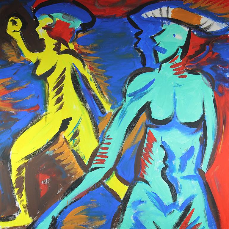 "At The Lake" is my expressionist acrylic painting on canvas, influenced by the works of Rainer Fetting, Helmut Middendorf, and the expressive style in general. I hope viewers will feel a sense of contemplation when they gaze upon the composition of the portrayed figures in the painting. The artwor...
