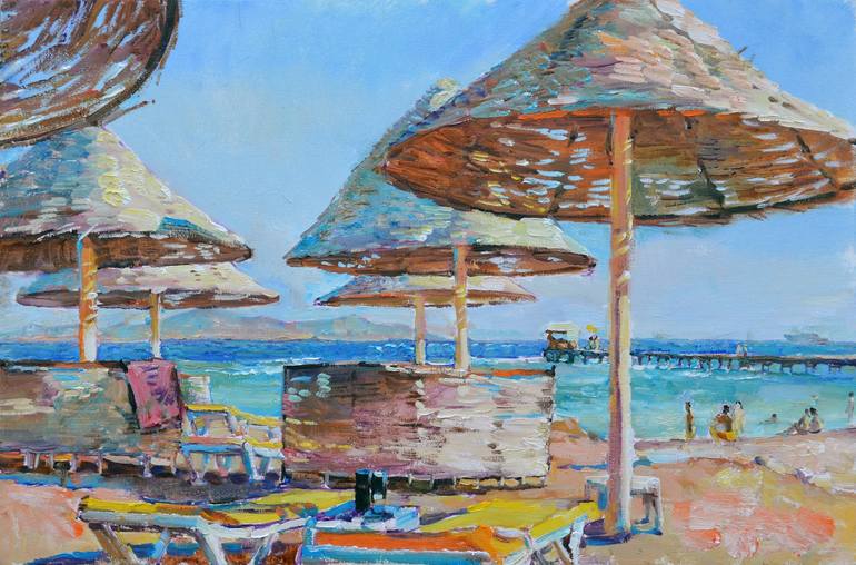The picture has a wooden frame, a gallery stretch of the canvas, so it can be exhibited without a frame. Professional oil paints, texture, and acrylic imprimatur are used here. On the Beach is made in the style of Impressionism from nature. The place depicted in the picture is the Egyptian resort of...