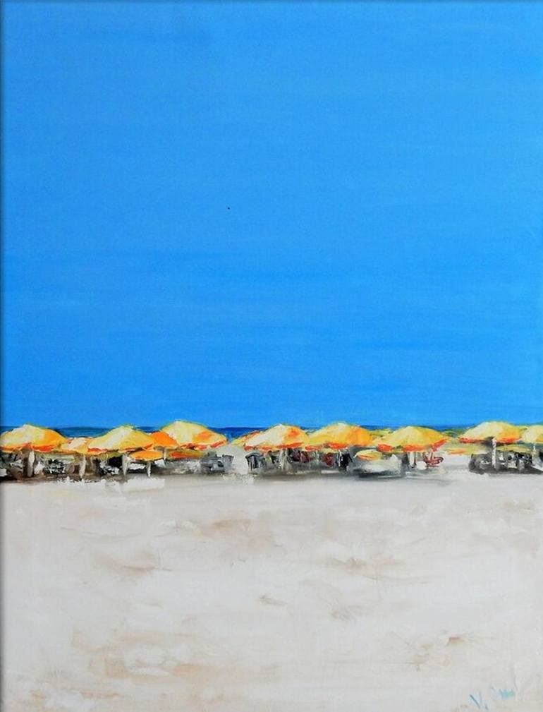 At the beach. Yellow parasols. Painting
