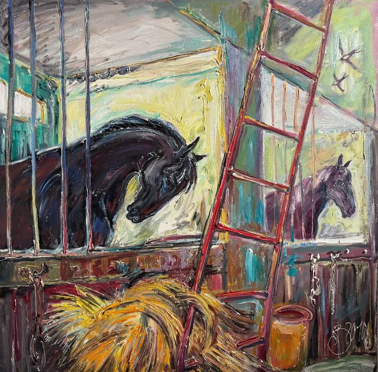 The inspiration for this work comes from the simplicity and serenity of rural life, capturing a quiet moment in a stable on a sunny day. The two horses, resting in the hay, evoke a sense of calm, while the ladder and the natural sunlight suggest a connection to the daily routine and the environment....