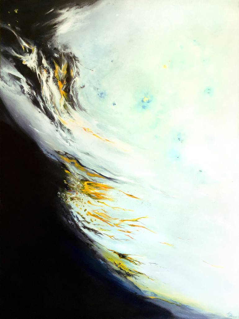 Third opus of the "Correspondences" series, mostly in black and white tones with turquoise hues, yellow and orange filaments seem to detach themselves from a dark hill and let themselves be carried away by the wind. This painting is inspired by the feeling of quietude in front of the acceptance of t...