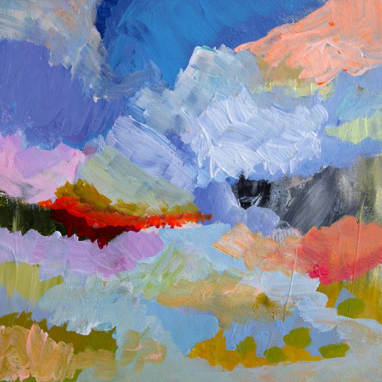 Small scale abstract impressionistic landscape with bright color, contrast, and texture. This painting is part of a small series which includes five paintings. Acrylic on cradled gessoed panel. Wired and ready to install. Signed on the back.
