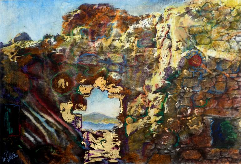 Atop Masada. Mixed media with black and white photograph and oil pastels on rice paper. From the series "Architectural Elements"