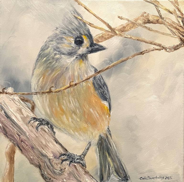 Tufted Titmouse - a frequent visitor to my yard, his lively song echos from the sparkling shadows throughout the day. He’s a little edgy, but he keeps me company in the studio. Hope you enjoy him too. Oil on canvas/Impressionism/Realism “Attitude”