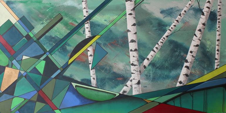 This work is about contrasts. Contrasts that arise between sharp edges of the geometric shapes and the naturalistic representation of the birches.