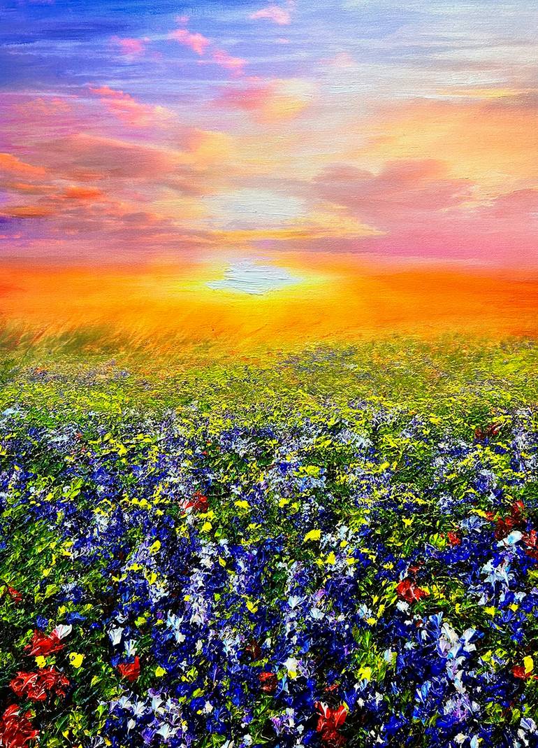 in this painting, I sought to capture the ephemeral dance of dawn, where the sky’s soft embrace meets the vibrant earth. The brushstrokes reflect the gentle touch of morning light spilling over a lush field of wildflowers. This canvas resonates with a message of renewal and hope, as each day begins ...