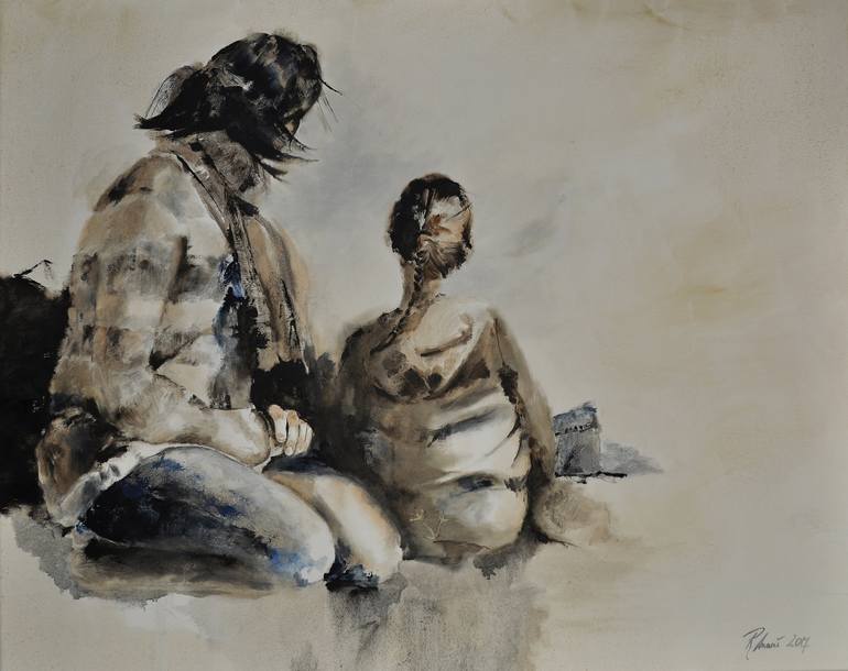 What touches me is beautiful light, a certain expression on a face and the atmosphere between two or more people. And how do I get the energy packed and painted? I also love material, such as jeans for example.If you want to get outstanding results in painting jeans, you have to focus on what you see only. And I love doing it! While painting, I am always searching for the perfect balance. This may consider the balance between hard and soft limits, light and dark tones, bright, soft or no color and rest and tension. I am aware of the borders and these extremes. Between these limits I am constantly looking for the perfect balance by restricting myself in color. At the same time I am looking for the greatest possible freedom. How little do I really need to show as much as possible? And how far can I go to explore the edges?