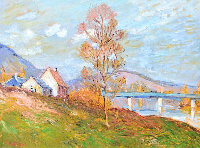 Près de Rouen , les bords de Seine se parent de couleurs vives en automne. des qu'un rayon de soleil apparaît, les couleurs illuminent le paysage. Toile faite à partir d'un dessin crayonné sur place et reproduit en atelier. ...