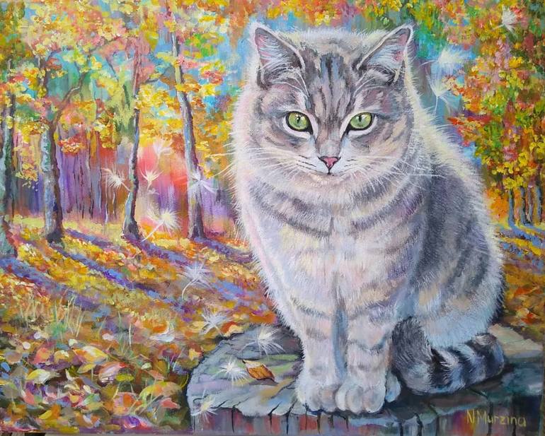This is a warm, vibrant acrylic painting with a soft touch of autumn melancholy. Inspired by pure love for nature and cats, this can add a unique cozy feeling to any home. Materials are fine acrylics on canvas stretched over wooden frame.