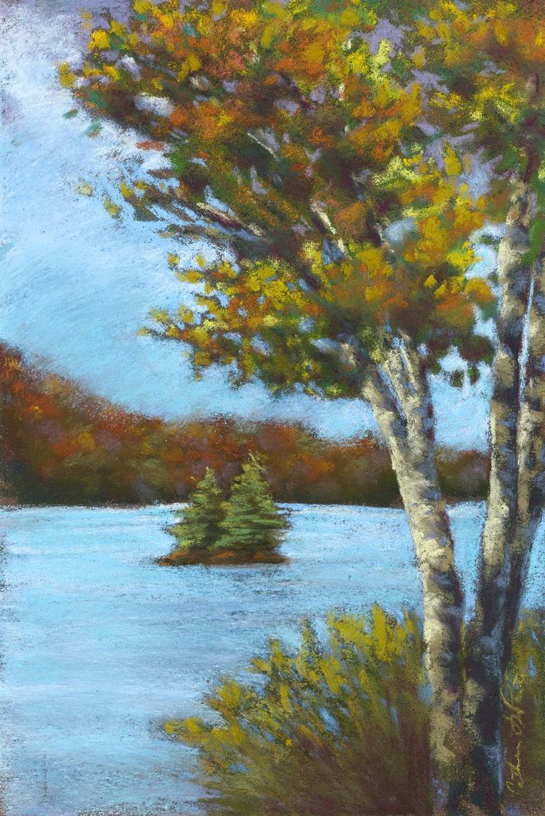 This listing is for an original signed and framed pastel painting of autumn leaves in October in the Adirondacks. "Late Autumn Over the Raquette" was painted during the Tupper Lake Plein Air Festival in 2019. The painting shows the beautiful fall colors lit up from behind.