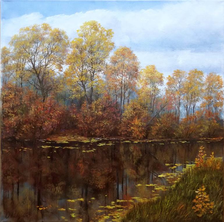 Realistic calm autumnal landscape with river and colourful forest. Oil on stretched canvas. Size: 50cmx50cm The painting is ready to hang and comes with a Certificate of Authenticity, signed by the artist. I am more than happy to undertake commissions, please just contact me. Artist: Oleg Riabchuk