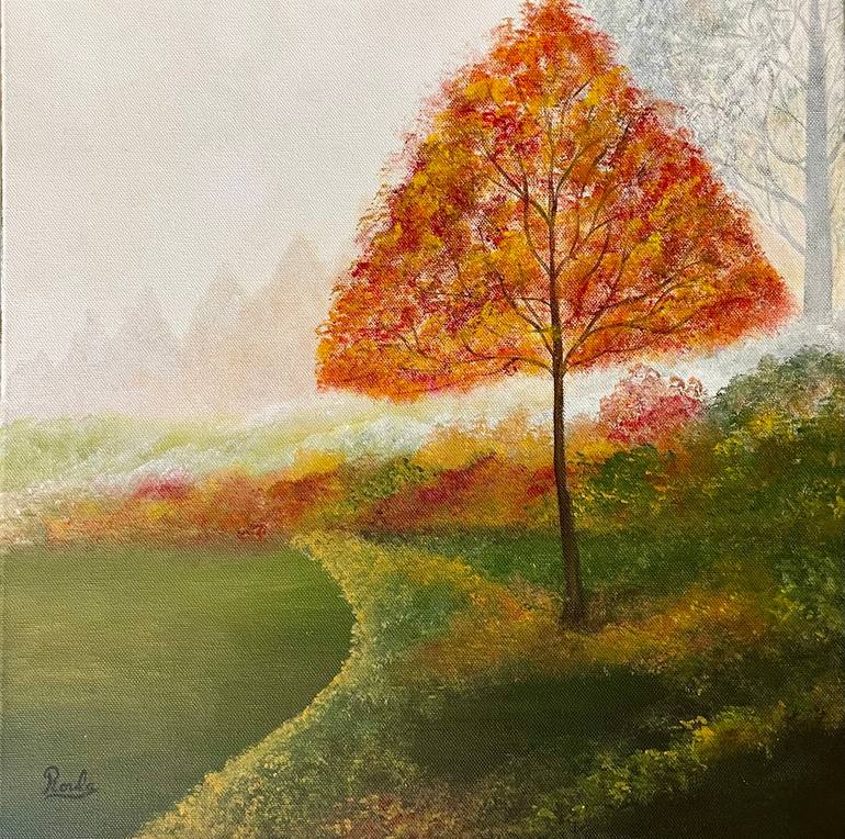 This painting captures the warmth and tranquility of a single autumn tree, its vibrant foliage glowing against a soft, misty background. The interplay of fiery reds, oranges, and yellows celebrates the fleeting beauty of fall, while the fading trees in the distance evoke a sense of peace and nostalg...