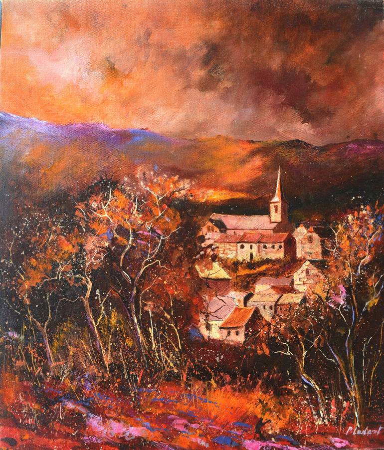 The work before us is a vibrant landscape painting, striking in its bold and brilliant use of colour. The scene depicts a village nestled in the heart of autumn, bathed in a captivating twilight. Warm hues dominate the composition, with flamboyant shades of red, orange and purple infusing the painti...