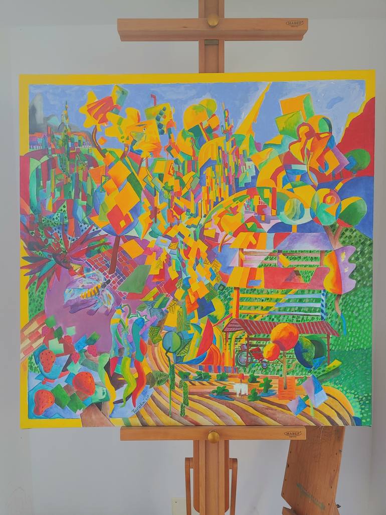 "Autumn in Slovenia" is a layered artwork, an interpretation of the season not as a traditional landscape, but as a collection of feelings and memories. The colors are vibrant, suggestive of movement. Architecture, fields and everyday life blend into a colorful mosaic. The artist uses acrylic, wate...