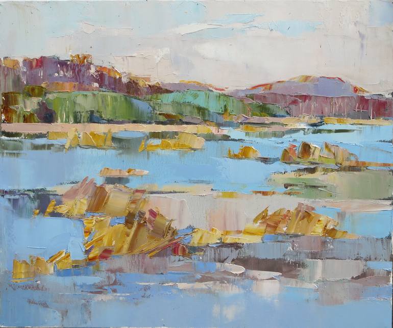 autumn lake, pastel colors - blue, violet, ocher, dry cane of complex ocher color illuminated by the sun