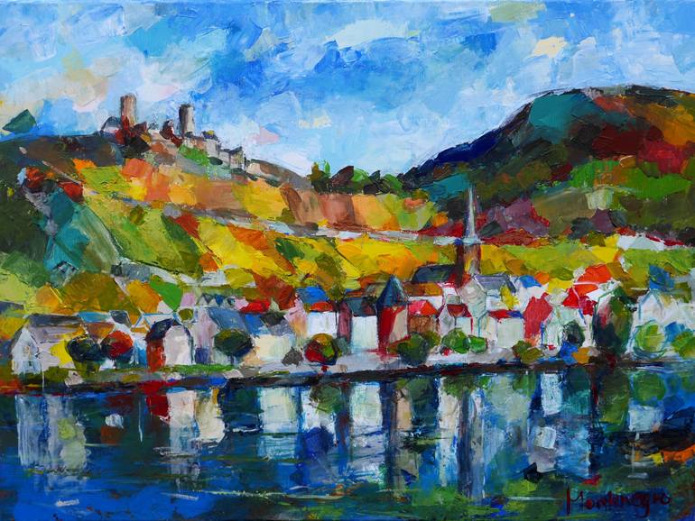 This artwork shows a Moselle landscape with autumnal vineyards near Alken with Thurant Castle. It was created en plein air. The sides of the painting are covered with paint, creating a lively, three-dimensional look. It does not need a frame and is ready to hang.