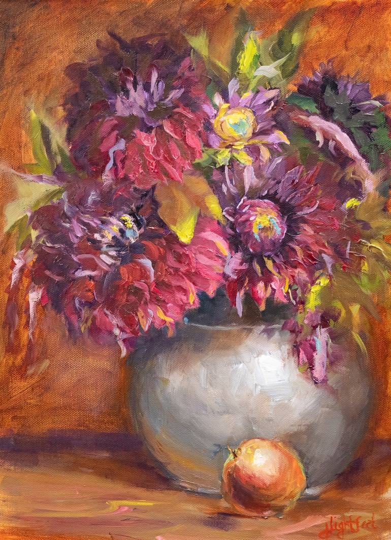 Jamie Lightfoot is an American fine artist known for her oil paintings which breathe light into their subjects. Her works explore themes of wildness, connection, and exploration, while offering a fresh look at the familiar. Whether it’s an elk stepping into a field, a woman walking down an empty ancient street, or a lonely ferry on the Puget Sound at dusk, Jamie’s works capture the longing of the soul and the beacon of light that calls us home and into our higher selves. Jamie’s work blends delicate realism and the expressive application of color and paint to create a look that evokes emotion, memory, and even a sense of mystery. Jamie was taught by regional artists specializing in impressionistic art and influenced by 19th-century masters such as Sargent, Zorn, and Sorolla. Jamie was mentored and individually tutored by renowned artists including Pam Ingalls, Cheri Christensen, and Henry Stinson. Jamie attended Gage Academy of Art. Jamie lives in the heart of Woodinville’s Wine District. She teaches a variety of art classes for kids, teens, and adults at Picket Fence Art Studio.
