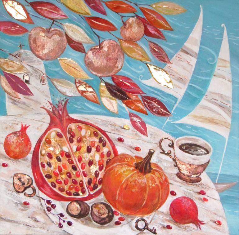 The breeze of the morning near the sea, while enjoying the fruits of Autumn. Idea is to represent the abundance and fines of the autumn days, with a hint of a little story that the spread keys and coffetalks to