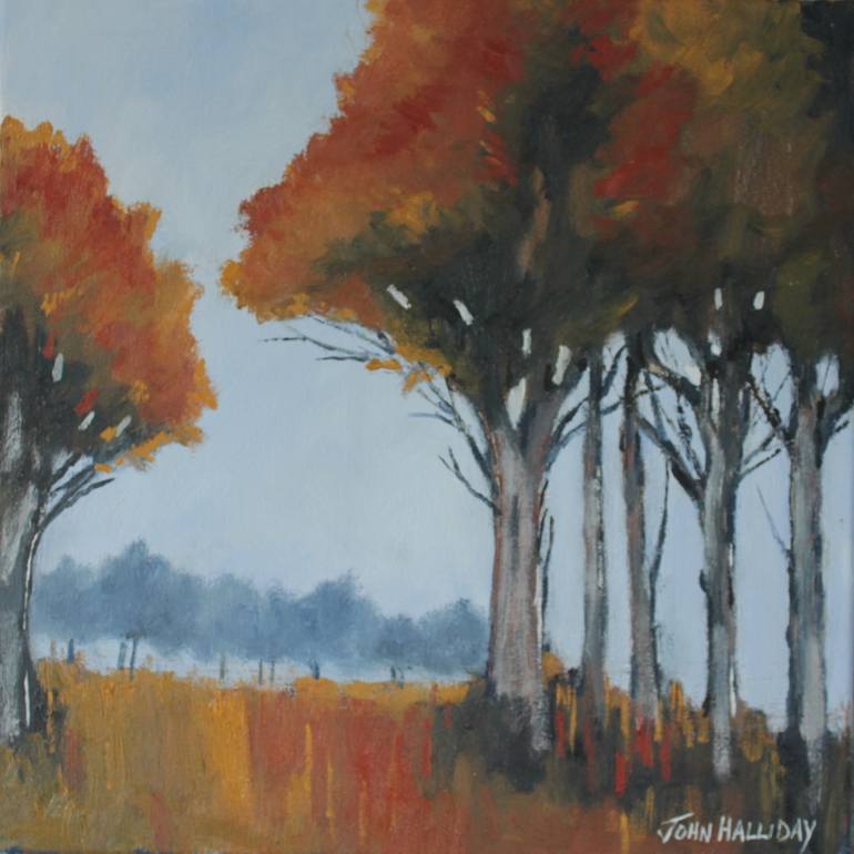 An impressionist painting of trees as they take on their autumn colours. Oil paint with brush and palette knife on canvas , 16 x 16 ins unframed. Certificate of authenticity included. Packaging - painting will be wrapped in acid free tissue, bubble wrap and protected by board front and back.