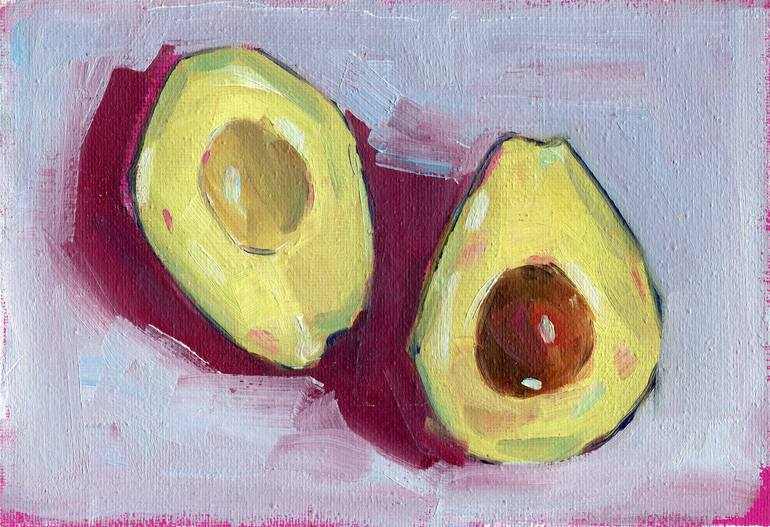 The picture was painted using the author's technique. This piece of art makes a stunning gift for your home or a loved one, bringing a touch of beauty and inspiration. A cut avocado in an oil painting conveys not only its culinary qualities, but also its aesthetic beauty and mouth-watering qualities...