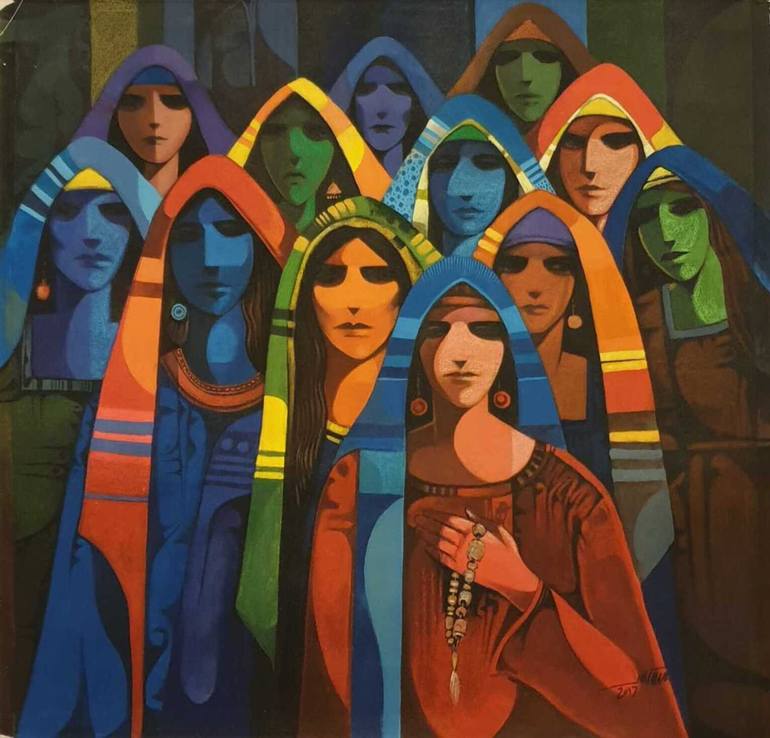 An Egyptian artist who believes the grandest thing in the universe is the human being and the grandest in the human being is the soul. Hence he is occupied in his works by capturing this soul in its various forms, manifestations, and contexts. His canvases always include individuals, particularly women, which represent to him a transparent container of the soul. Through the faces of women he captures the unique status of the soul, its emotions, values, problems, and deepest secrets. Magdy El Kafrawy is occupied by the classical composition of the canvas as his colors interact in harmony and balance. He is fond of playing with tones and shades of the same color to the extent one might view the one canvas is a display of a full color gamut of the same color. He also manipulated his favorite color material, Oil, to be malleable and change from its normal coarse nature to the smoothness of water colors. Shadow and light are the heroes in his works. They change by the change of the light entries and affect the tone of color until their sources virtually disappear and you feel it in the strength and fading of color. Decoration also has a prominent place in his works. If individuals are the soul of the canvas, the motifs are the geography of the soul. Its history, places, tales, and its dazzling world of abundant details which tell you a new story every time you look at it.