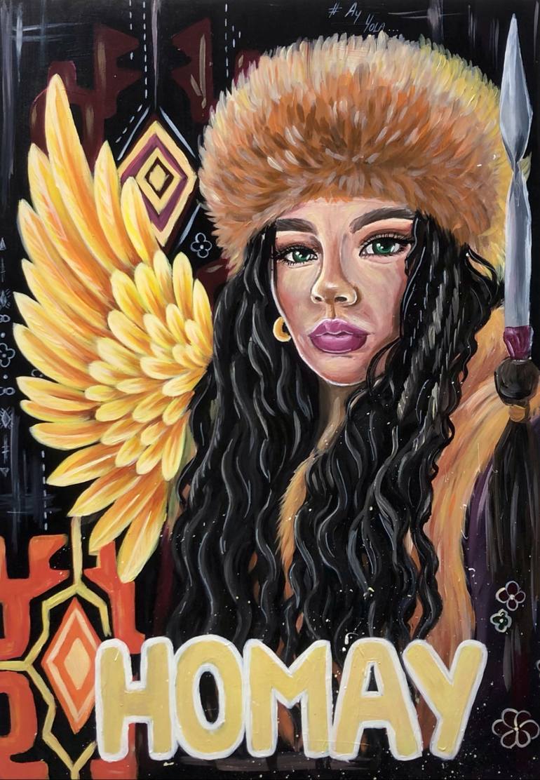 “Ay Yola – Homay” is a captivating ethnic art piece, an acrylic painting inspired by the singer Ay Yola and her evocative song “Homay.” This original handmade painting features a striking portrait rendered with bold brushstrokes and warm, earthy tones. A symbolic golden wing represents strength, pri...