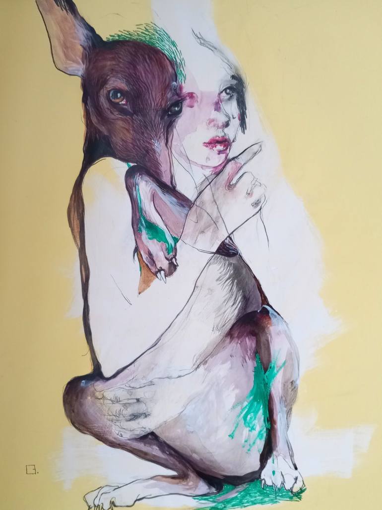 "Her beautiful mixed-media paintings find the middle ground between art and illustration, providing the viewer with endless enjoyment and interest. In many of the artworks, Olga keeps her colours nicely muted and calmly toned, to create a soothing effect that beautifully emphasises the naturalistic elements of her work. She pays an incredible amount of attention to the anatomical details of the animals she represents, ensuring that each creature is skillfully and accurately captured. Her work has a peaceful feel to it, created by the wonderful subject matter and glorious palette. In this collection, fishes swim happily, horses smile or watch the world go by and a group of deer scatter in the falling landscape. Each image is perfectly coordinated with the ideal colour to bring out the glitter in the sky or the twinkle of an eye. Every detail is highlighted and shown in its best light, each toothy smile or playful glance. The creatures are the stars, but the painter brings out their best. In some of my favourite paintings, a group of birds watch the flood, safe in the knowledge that they are free from harm. The swimming blues cascade together and contrast stunningly with the dashes of red and yellow. The form of the birds in the foreground opposes the twittering masses flying away. In other works, hares are caught out in acid-coloured washes that turn them from cute animals into blazing pop-art icons. Horses share a whisper and talk amongst themselves about issues that humans couldn't possibly understand. In Gal's world, birds and rabbits are present at political gatherings and cows and cats know secrets and communicate in their own special language. I think these delightful works would make a great gift for an animal lover, or would equally be at home in a café or restaurant anywhere in the world. With a lightness of touch that makes them so special, their quirky energy would light up any room and provide a buyer with years of happiness."