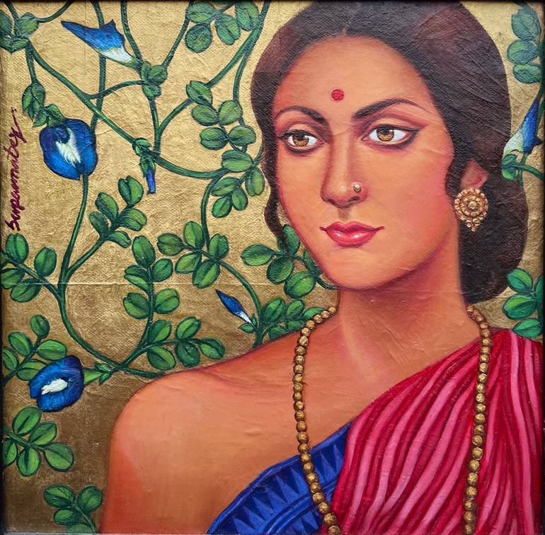 In this painting I portrayed a Bengali lady with my personal poetic vision. The bluebellvine in the gold background create a organic rhythm in this painting. Here I use bold colour and gold embellishment to create a wonderful counter play with the soft brown skin tone of the lady. The delicate face ...