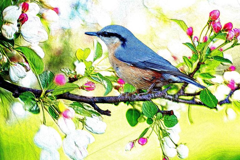 WATER COLOUR BIRD ON FLORAL BRANCH PAINTING ON PAPER