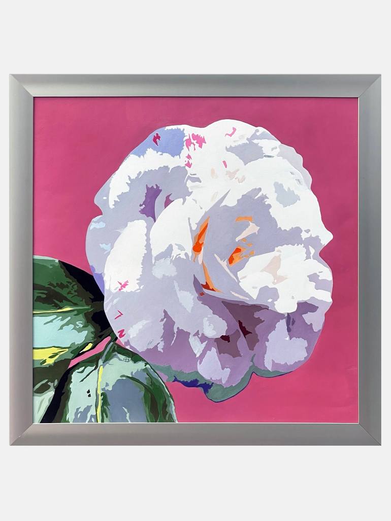 BLOOM XXXIV MAGGIE presents a deconstructed camelia, showcasing ruffled, pristine white blooms reminiscent of an elegant winter display. The semi-double flowers offer a striking contrast against an imagined backdrop of dark, glossy, evergreen leaves. This original oil painting is meticulously broug...