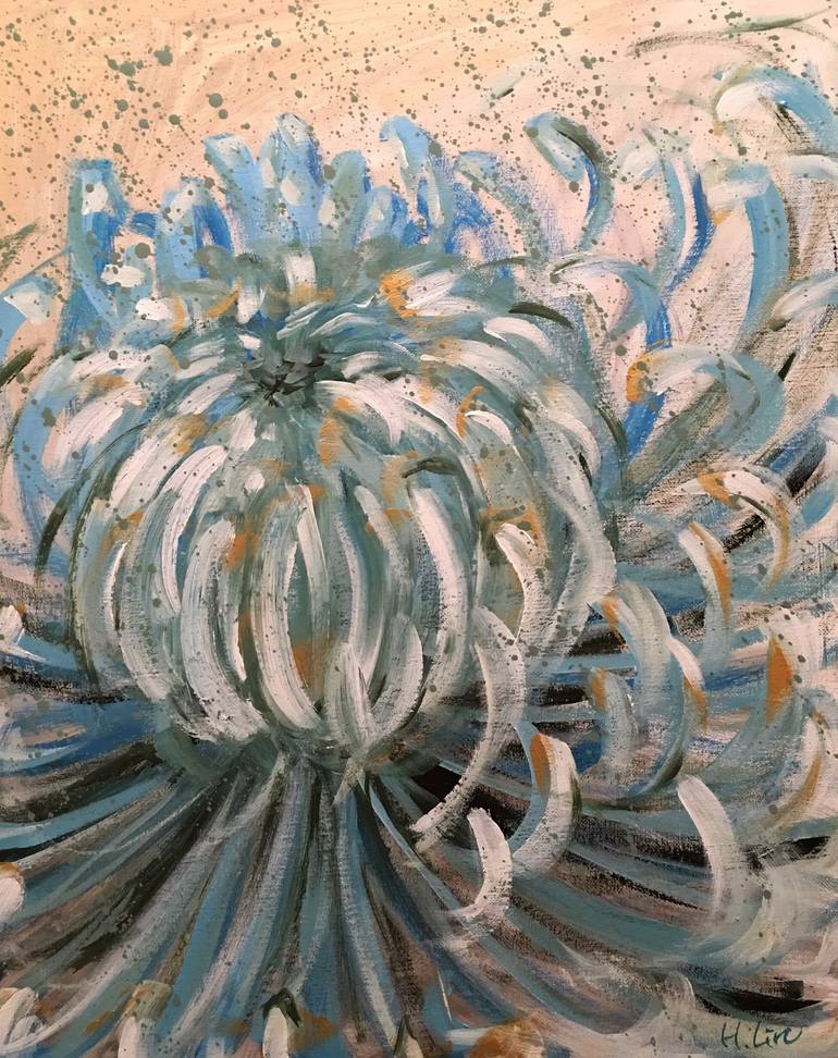 FIND YOUR BALANCE - BLUE CHRYSANTHEMUM By HSIN LIN 05/08/2018 40.6 x 50.8 X 1.5 cm Textured Acrylic on Acid free Gesso primed Canvas ready to hang Side panel painted: Green Metallic Gold paint are used . It actually shines beautifully when you look at the physical painting. Life may be chaot...
