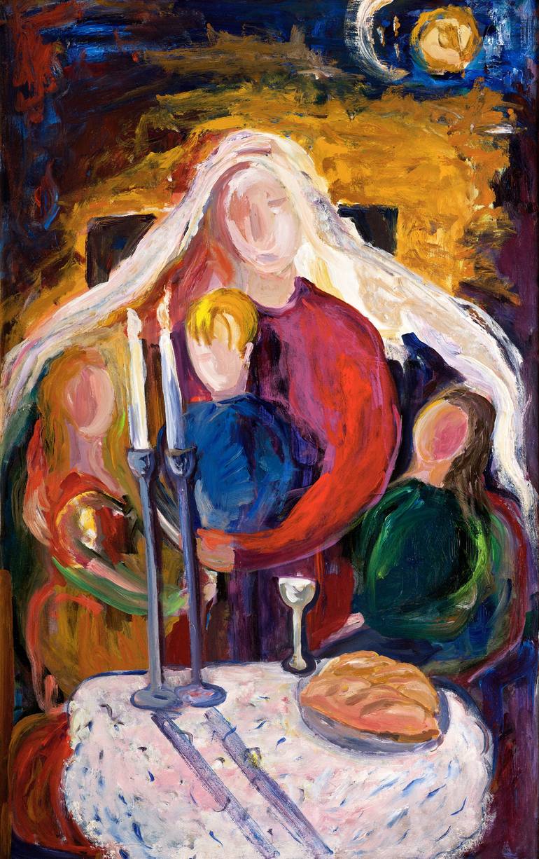Bringing in the Sabbath is a modern painting based on a photo that my husband took of me and our children as we lit the Sabbath candles. I had always wanted to paint this particular women's moment but it took me years to finally feel confident to capture its serenity, its power, its sense of family ...