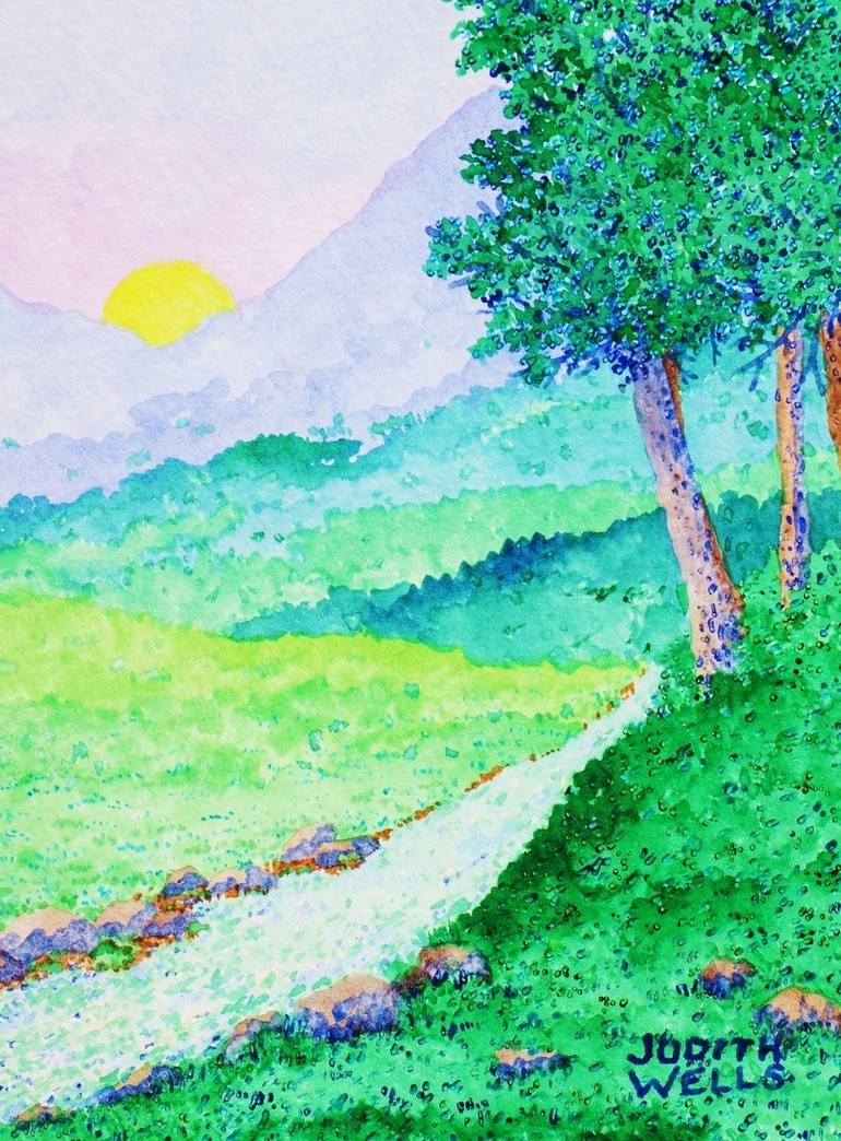 A bright yellow sun on the mountain horizon sheds a sunset-like intense color glow upon this scene of a babbling brook. Beautiful, bright shades of green and blue are used in the lush green foliage.This is one of a series of small watercolor paintings that I created to make original art affordable t...