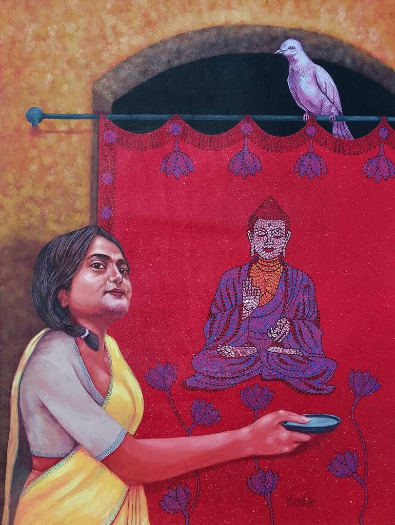 The painting "Buddha with Sujata" depicts an event from the life of Siddhartha Gautama, the historical Buddha, before his enlightenment. Sujata was a young woman from a nearby village who offered milk rice to Siddhartha, who was practicing extreme asceticism at the time. This act of kindness and gen...