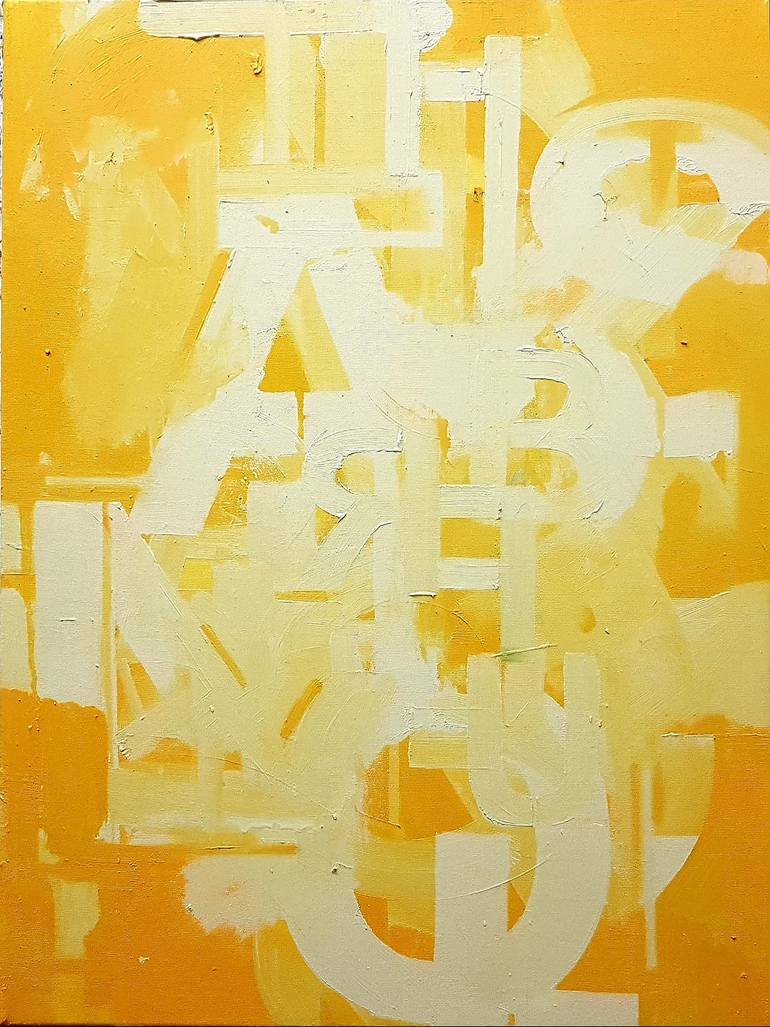These paintings have evolved from my prior chair paintings and are a continuation of my exploration of change, evolution and identity. Similarly, I start these paintings by overlapping stencilled letters from the alphabet, one on top of each other until they start to lose their identity as a “letter...