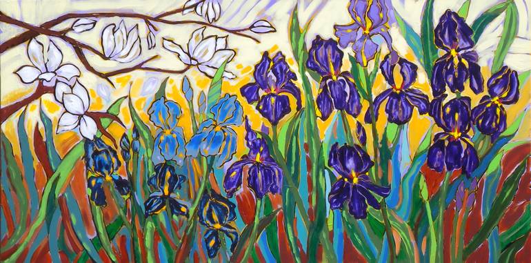 I think there may be a series here. I haven't painted flowers before and really had fun with this one. I just love Irises and the purple ones always stop me in my tracks. I was thinking of the Van Gogh garden paintings and this happened. Hope you like it. This painting is ready to hang and is a one ...
