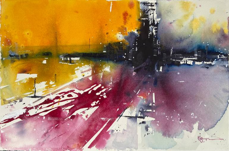 A vivid watercolor abstract with deep saturated colors portray the return to the dark city life. Created with quality professional pigments on 100% cotton paper.
