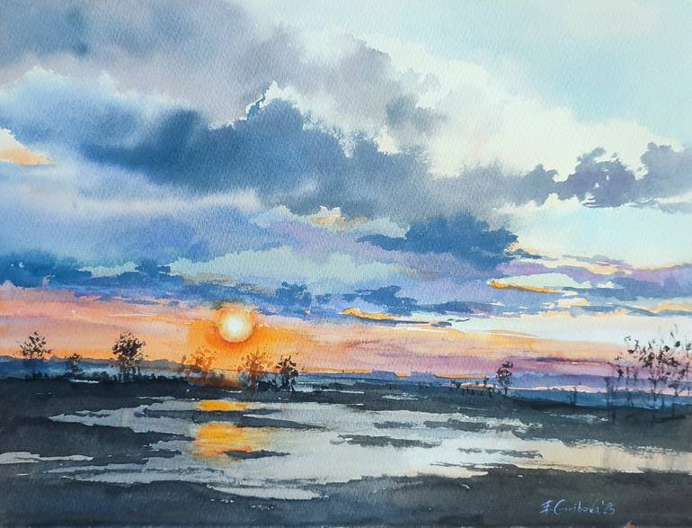 The dimensions of the watercolor are: paper size 37,9x28,2cm (S. Waterford paper, 100 % cotton, 300 gsm, Cold Press). Professional watercolor materials used. Ready for framing. Shipped without a frame, well protected between cardboards in a box. Author - Elžbieta Gribova Please note that the ...