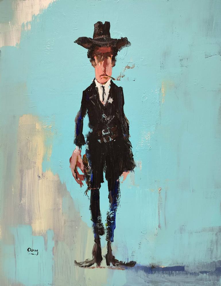 Fantasy scene, cartoon cowboy (own original character, created by myself). Acrylic and gesso on wood (2 mm.)
