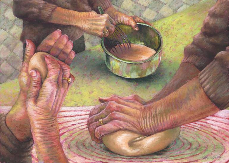 20x28" pastel painting "Baking Day With Grandma". This is one of a series of hand portraits I'll be doing this year, although this one is unique and special to me. My grandma's homemade bread is one of my fondest memories as a child. I don't know why it has taken me this long to have her teach me ho...