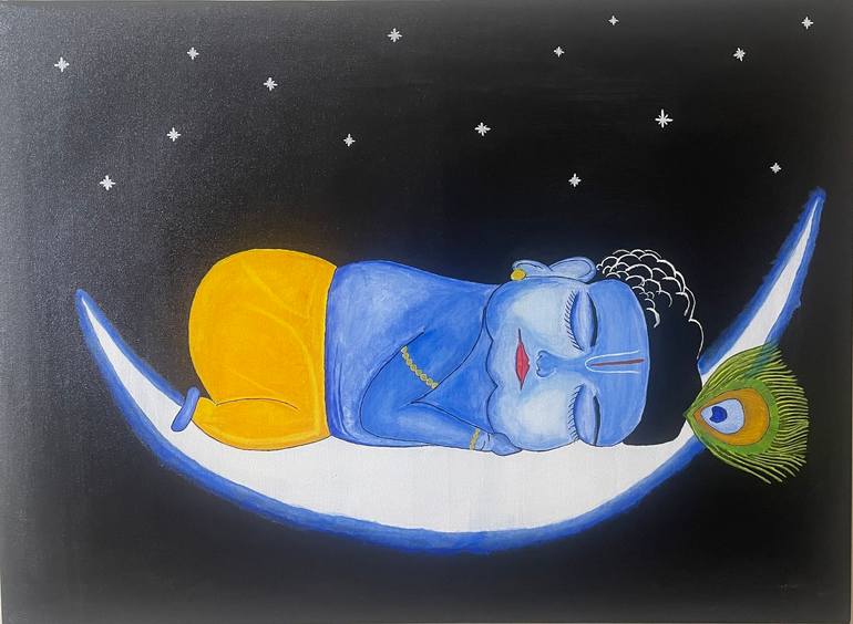 Inspired from Krishna consciousness of Indian Mythology, self-imagination of child krishna sleeping in a relaxed mood on the crescent moon, it feels relaxed, especially people who are fond of kids and krishna Medium - Acrylic and finished with Varnish coating Subject - Child Krishna Style - Imagina...