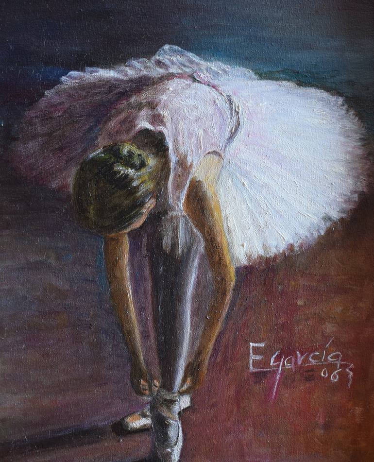 I always liked Hamilton's photographs. This dancer is getting ready, and the details are important. She knows that the fit of her slippers is the most important thing of all. The subtlety, the gathering and the control. Everything has to be in place. Like a swan the dancer curves in on herself be...