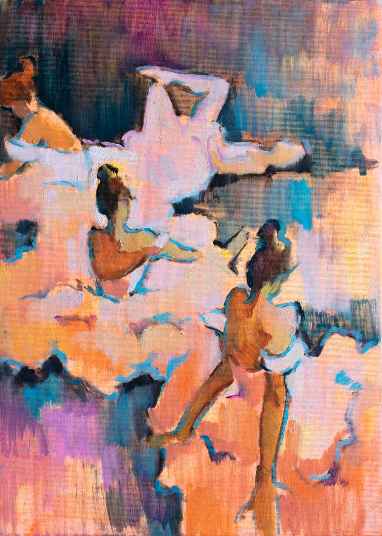 Ballet dancers having a rest after perfom. I wanted to depict grace of dancers, even when they are tired and resting. And I wanted to show that they are also same people, as we. Even they looks more fragile. But the all beuaty they present is the result of a greate labour. Every day they make this e...