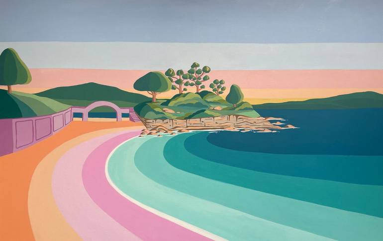 The view over Balmoral beach at sunset, framed in Tasmanian oak.