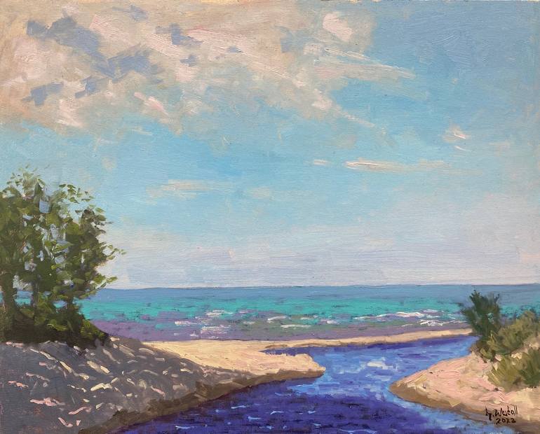 Plein air, Poland, 2022. Painted where the Czerwona flows in the Baltic Sea. The day was hot, sunny and calm. The colors were wonderful, just beautiful. Oil on HDF primed, with Gesso.