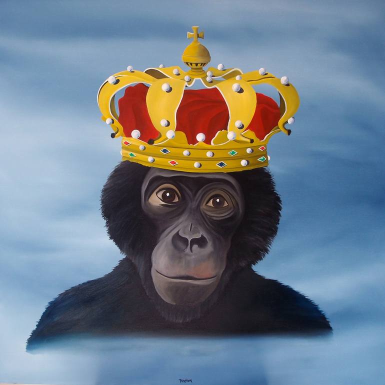 A chimpanzee is the protagonist of this painting. On his head a royal crown, but if we look closely we notice that the crown is made of banana peels...
