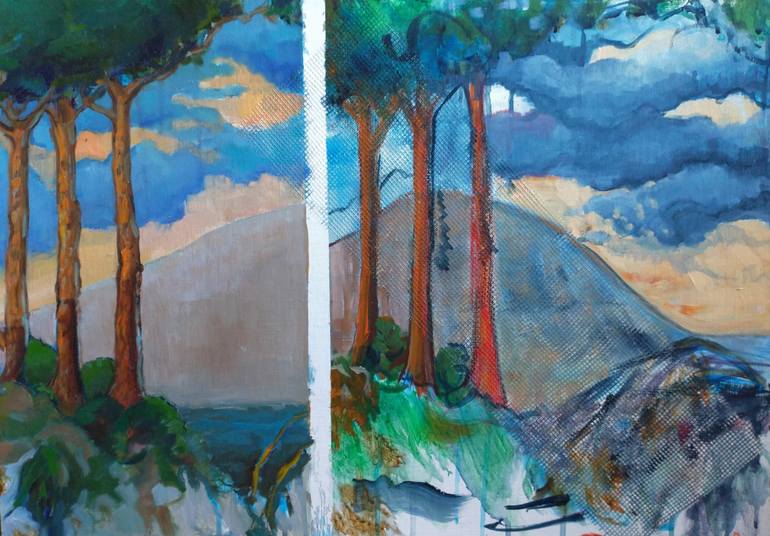 This work is handpainted on gessoed cardboard with an added element of fiberglass tape, using acrylic and oil paints, as well as sanguine and crayons. Picturing two similar, yet altered by time tranquil scenes, that feature trees on a small abundantly green cliff, shifting clouds and a mountain fi...